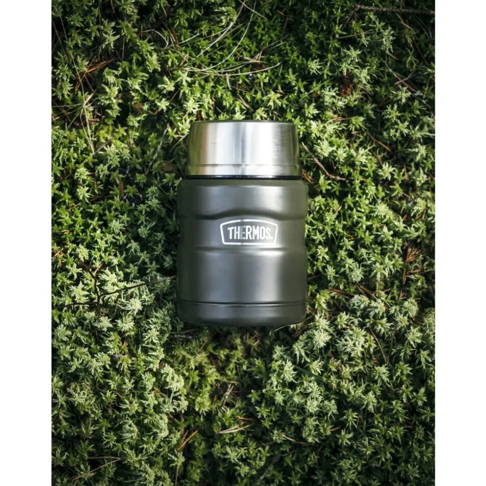 Thermos Stainless King 470 ml madtermoflaske i rustfrit stål med foldbar ske i låget. Låget kan bruges som spiseskål til fx suppe eller som kop til dine drikkevarer. Velegnet til både kolde og varme drikke, og holder indholdet varmt i op til 9 timer og koldt i op til 14 timer.