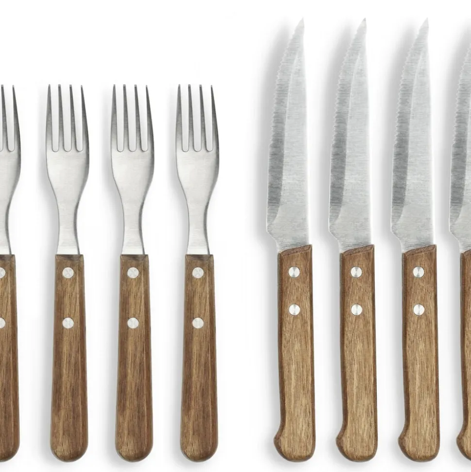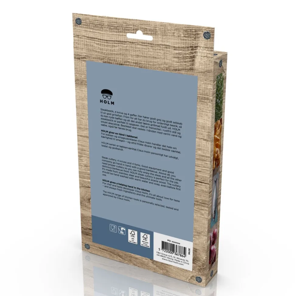 Steakbestik, 4 knive og 4 gafler. Der hører godt grej og godt selskab til en god grillaften. Frem for alt har du brug for ordentligt bestik, så du kan nyde bøffen og alt det andet lækre grillmad fuldt ud. HOLM steakbestik er perfekt til opgaven. Det er fremstillet i rustfrit stål og smukt akacietræ. Bestikket skal vaskes i hånden med varmt vand og sæbe, også før første brug.