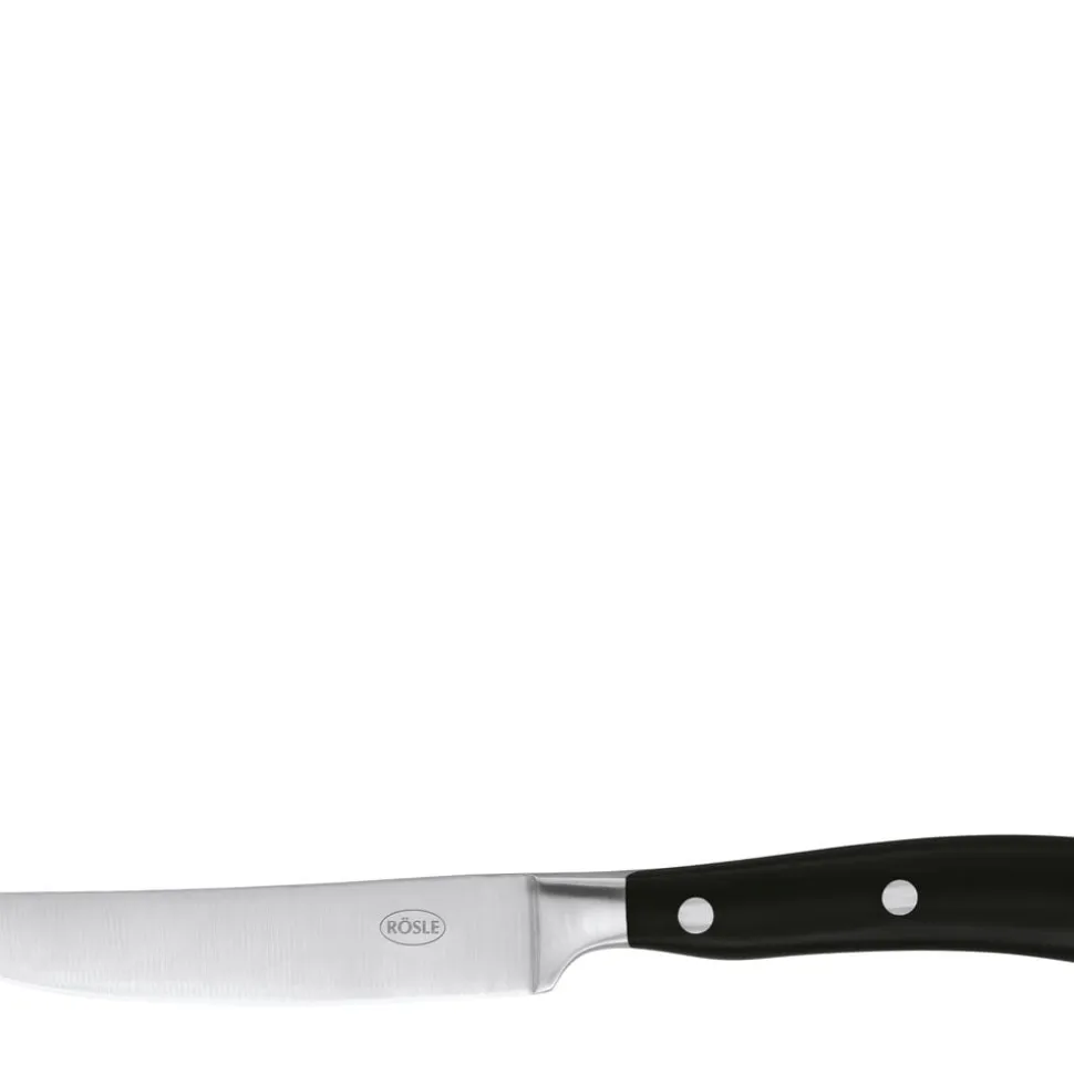 Sæt af 4 RÖSLE steakknive. Plastikhåndtag i POM med tre nitter. Knivblad i stål. Leveres i flot trææske.