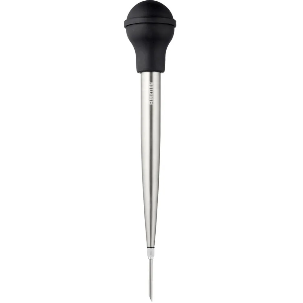 Stegepipette i stål og silikone, 32 cm. Rummer 40 ml. Stålet tåler høje varmegrader, og pipetten er derfor ideel både til at opsuge væske fra madlavningen, som fedtudskiller og som marinadesprøjte. Der medfølger nål og rensebørste. Velegnet til opvaskemaskine.