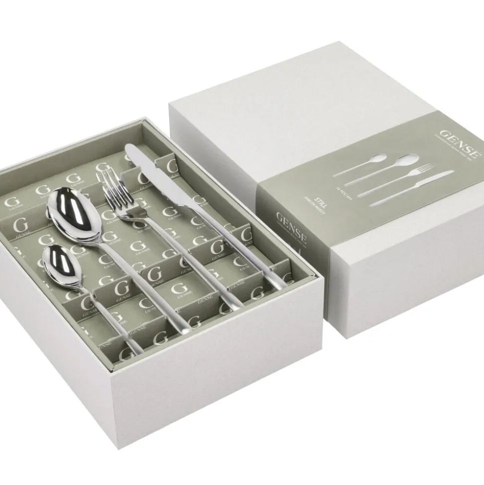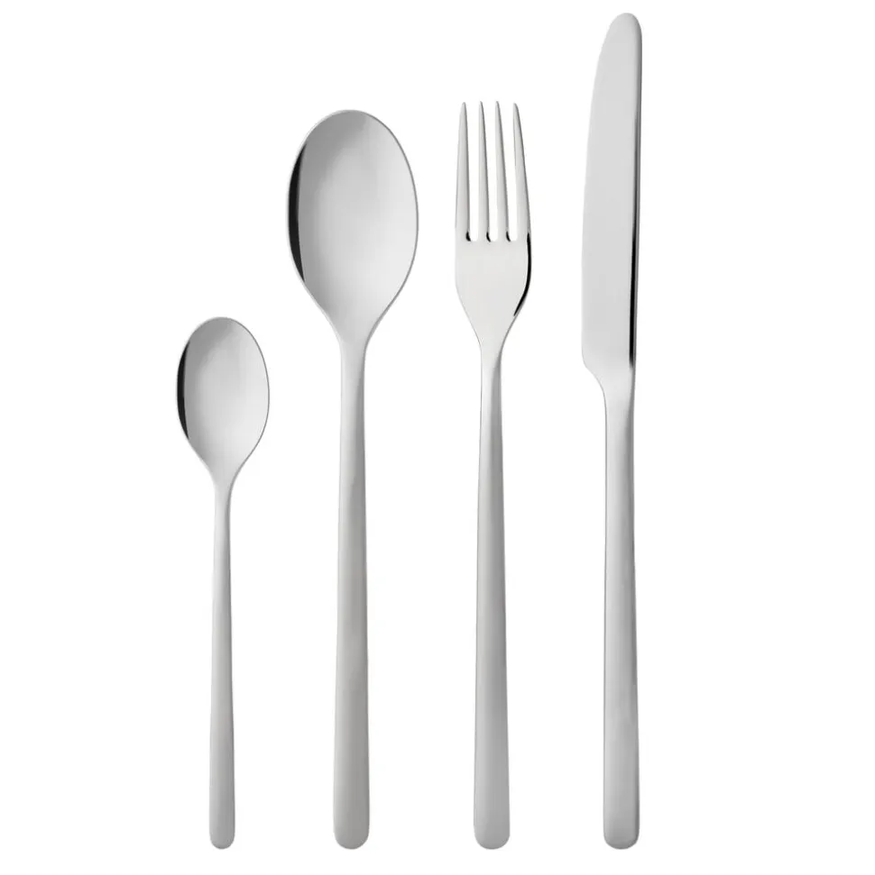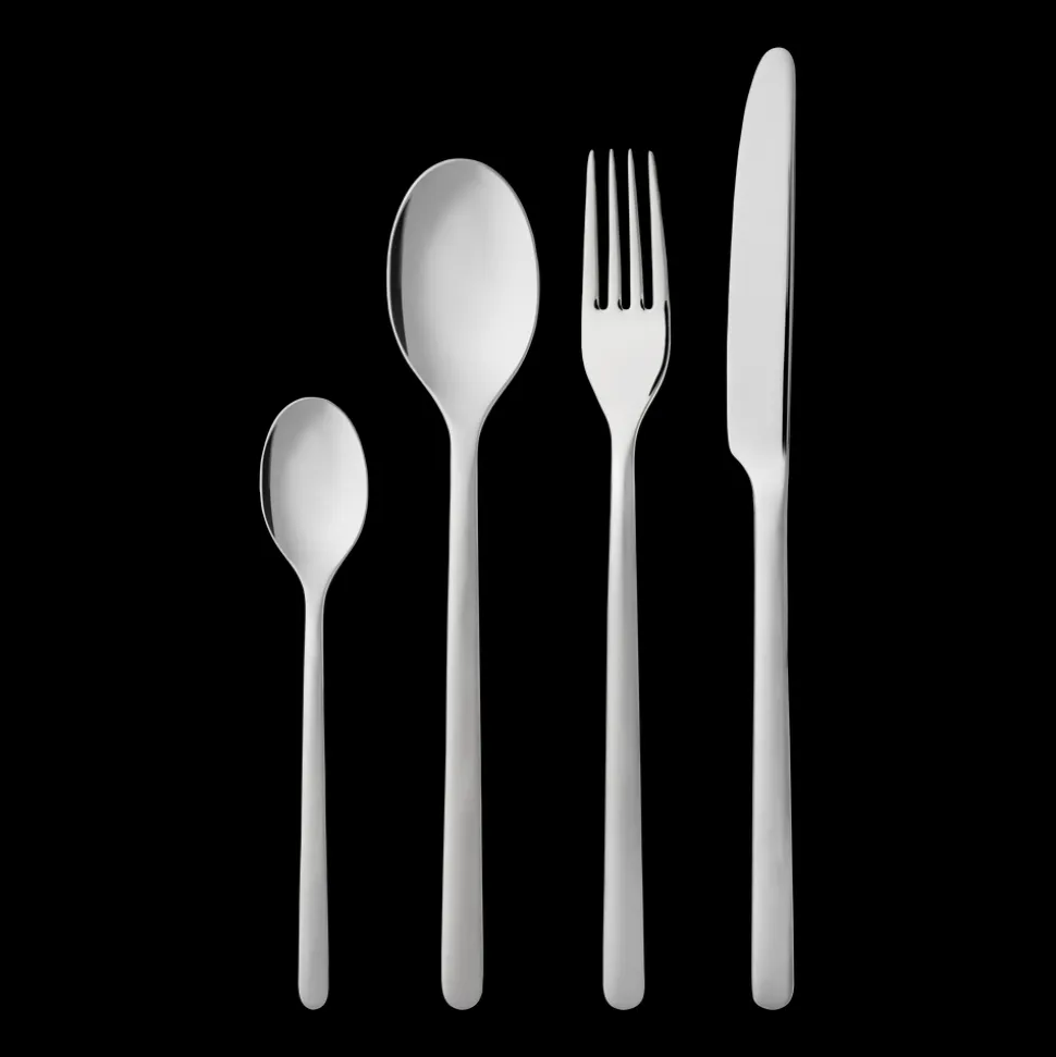 Med sin enkelhed og lange linjer understreger de bløde skulpturelle kurver og de roligt udformede detaljer den moderne og nordiske sans. Et underspillet, rent design skaber et elegant bestik, der nærmest svæver over bordet.