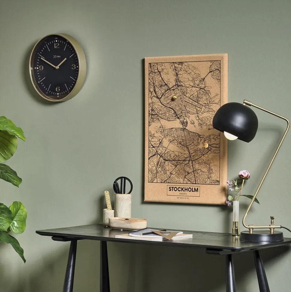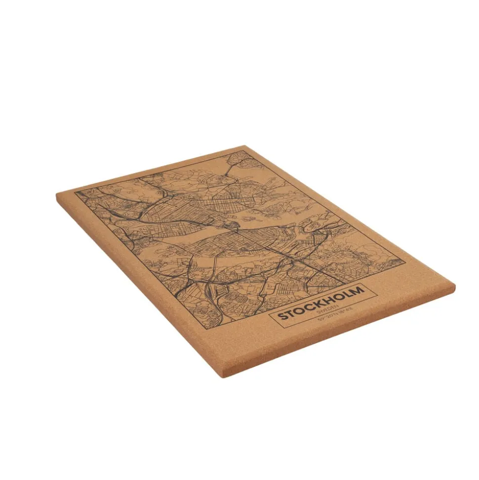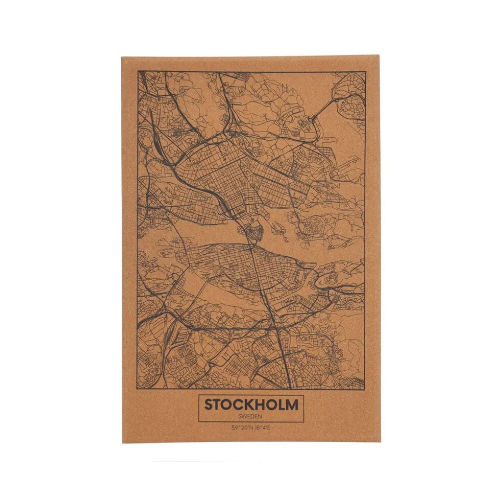 Bykort med Stockholms vejnet på korkplade uden ramme.