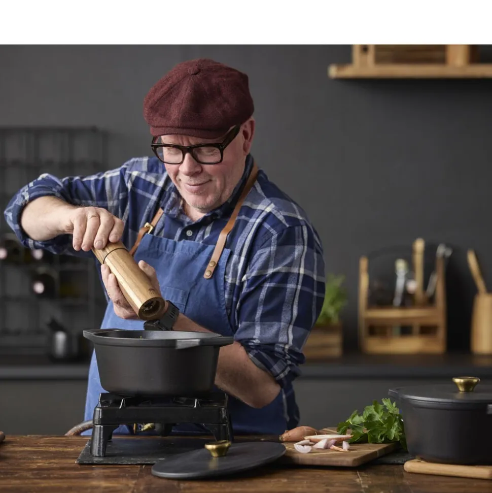 Støbejernsgryde, 3,6 liter, med en 3-lags mat sort emaljecoating. Gryden har grædelåg, det vil sige, at et relief på indersiden af låget opfanger den varme damp og lader den dryppe tilbage i gryden og give smag til retten. Støbejern holder godt på varmen og fordeler den jævnt og effektivt. Gryden kan anvendes på alle varmekilder samt i ovn og på grill. Det er vigtigt at løfte gryden, når du skal flytte på den – skub den aldrig frem og tilbage på komfuret, da det kan ridse. Støbejern er ikke egnet til sure fødevarer og må aldrig benyttes til langtidsopbevaring. Redskaber i træ, plast eller silikone anbefales. Håndopvask med varmt vand og opvaskemiddel anbefales, også inden første brug. Sørg for at støbejern er helt tørt, inden det sættes væk, så der ikke dannes rust.