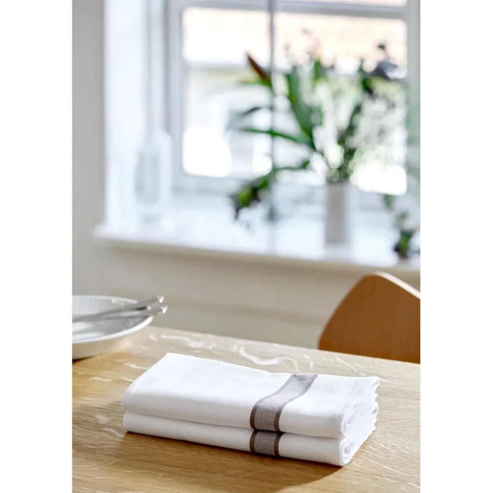 Stofserviet fremstillet i 100 % bomuld. Det klassiske hvide stof kombineret med en enkel farvet stribe giver mulighed for et let og personligt udtryk. Servietten er blød, behagelig og nem at folde, så du kan variere udtrykket, når borddækningen skal have lidt ekstra opmærksomhed.