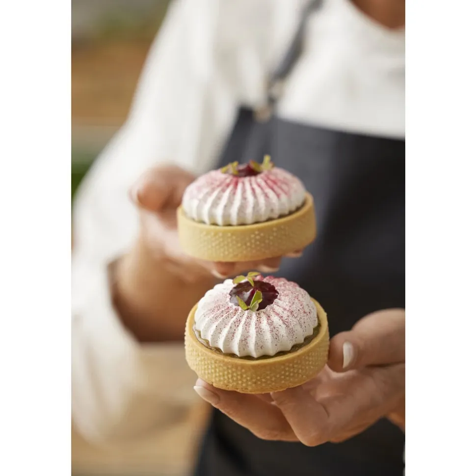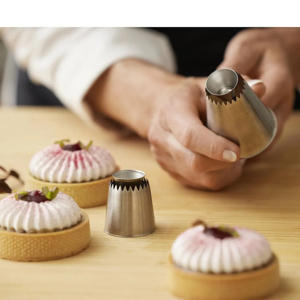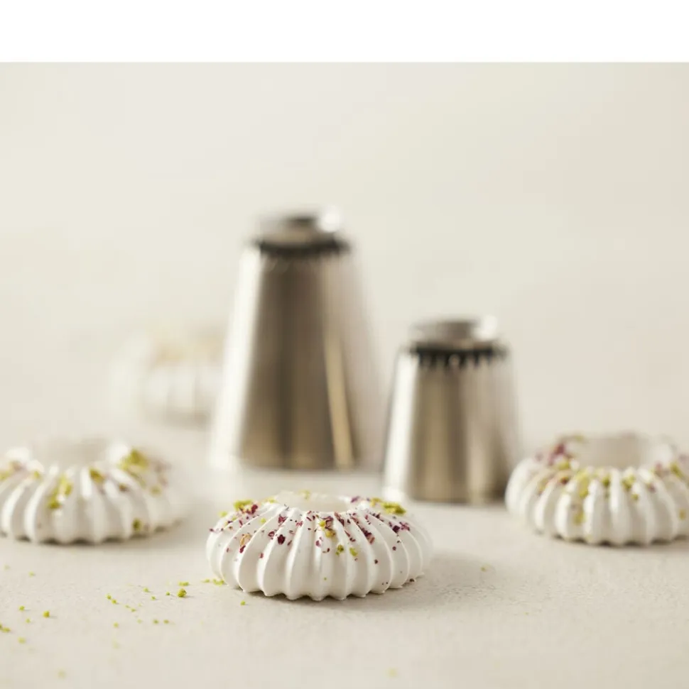 De to Sultan-tyller laver en fin stjernekruset ring med et glat hul i midten i to størrelser. Tyllen er rigtig god til marengs, smørcreme, piskede cremer, blød kransekagemasse, blød småkagedej m.m. Pynt f.eks. dine muffins eller tærter med lækker creme og fyld hullet med god marmelade. Det ser både smukt ud og smager superskønt.