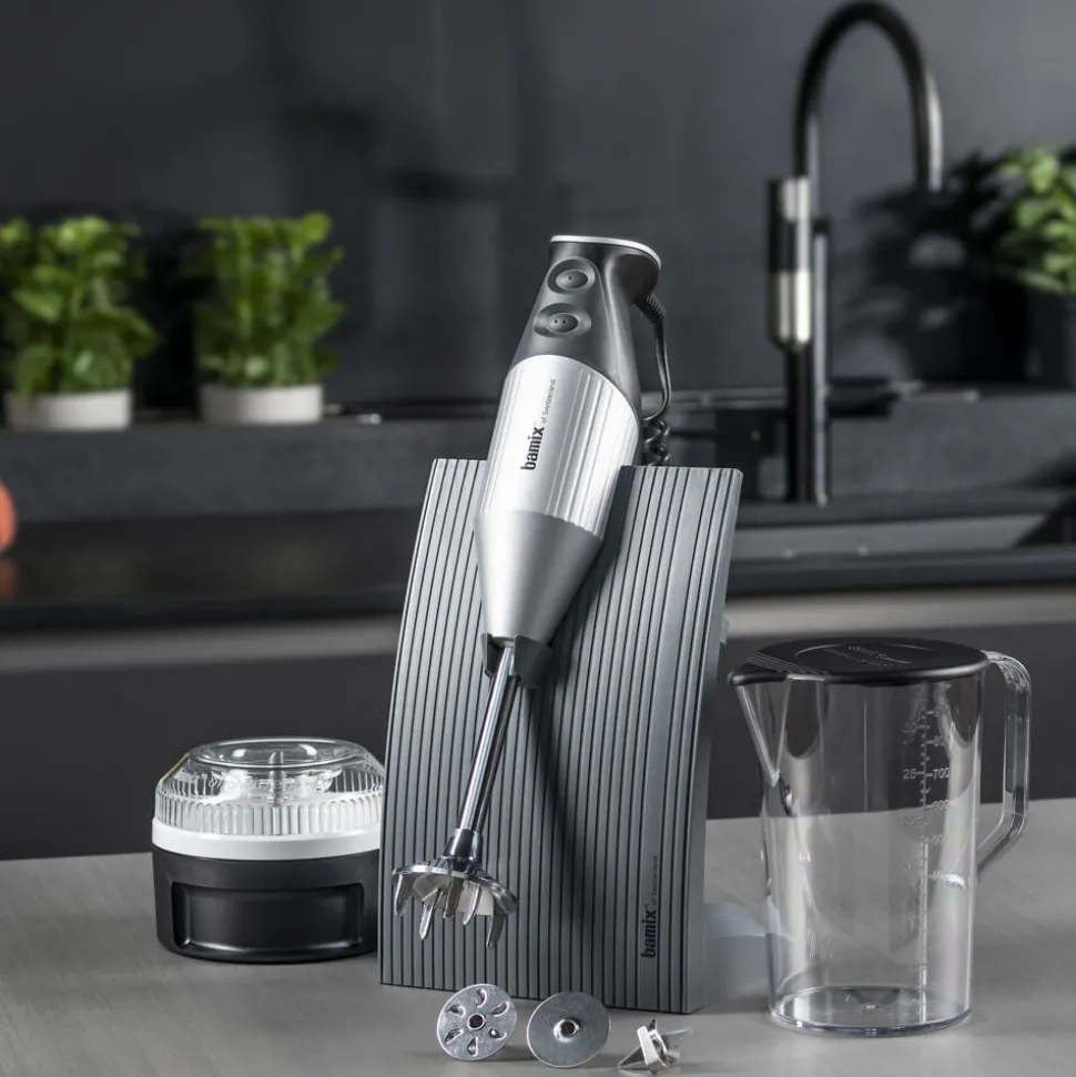 Med din bamix® Swissline og dens tilbehør kan du piske, purere, røre, blende, mikse, male og hakke.