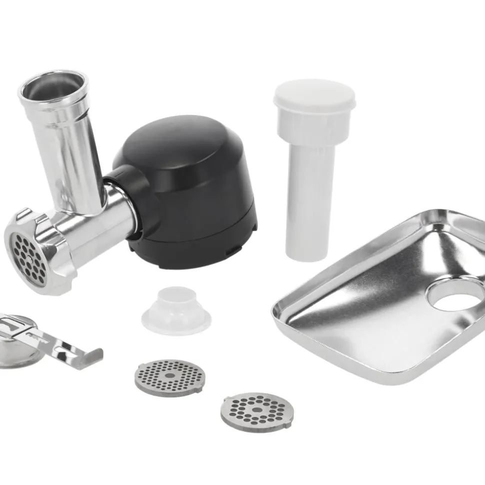 Tilbehørssæt til Blomsterbergs køkkenmaskine XL bestående af kødhakker, pølsehorn og kageplade.