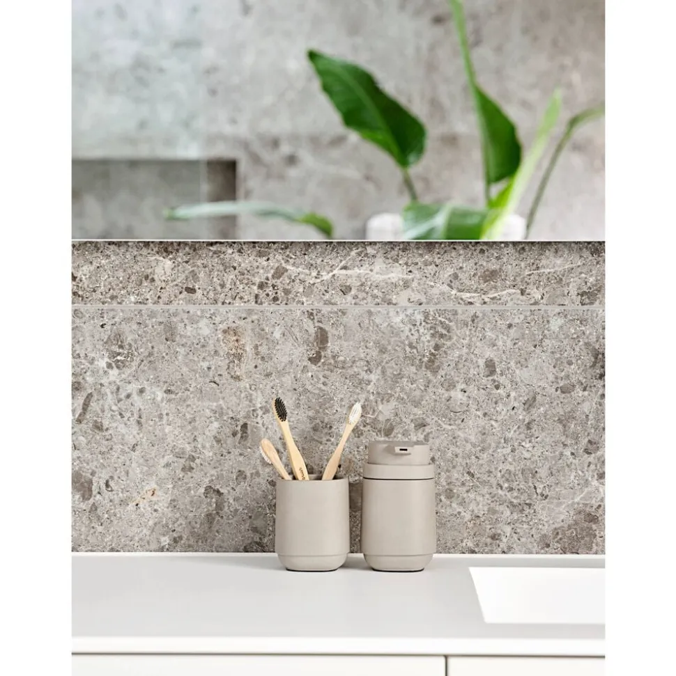 TIME badserien får dig til at kigge en ekstra gang. Tre af seriens fire produkter – nemlig sæbedispenser, tandbørstekrus og toiletbørste – er udført i beton og blot suppleret med få plast-detaljer. Pedalspanden er derimod ren ABS-plast, men matcher beton-produkterne farvemæssigt, så serien fremstår som én stærk helhed. Beton er kendt for sin kompromisløse karisma og naturlighed og har de senere år vundet indpas i boligindretningen. Det er på én gang hårdt, blødt og meget smukt. Endelig er det et lidt mere energibesparende materiale end fx keramik, da det ikke skal brændes ved høj temperatur.