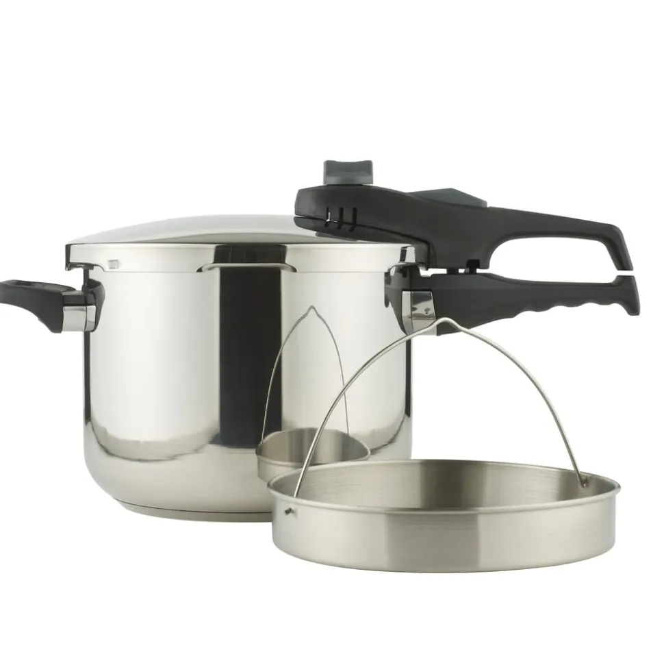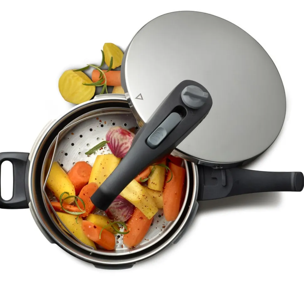 Trykkogerens elegante design i rustfrit stål gør ikke kun madlavningen nemmere, men tilfører også et stilrent præg til dit køkken.