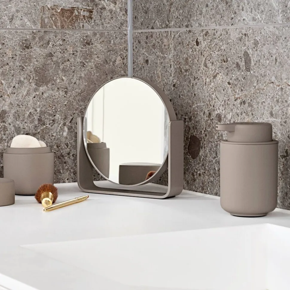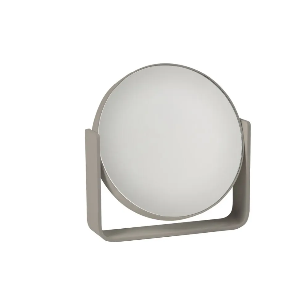 Uundværligt bordspejl, der pynter, hvor end du placerer det. Den ene side er almindeligt spejl, mens den anden forstørrer hele fem gange. Spejlet roterer sikkert om egen akse, da det bæres af en bred aluminiumsramme, som samtidig udgør spejlets stabile base. Det er pulverlakeret og har et fint mat look. Spejlet glider smukt ind i den populære UME-serie og fås i alle 7 farver: Black, White, Soft Grey, Grey, Eucalyptus, Taupe, Olive Green.