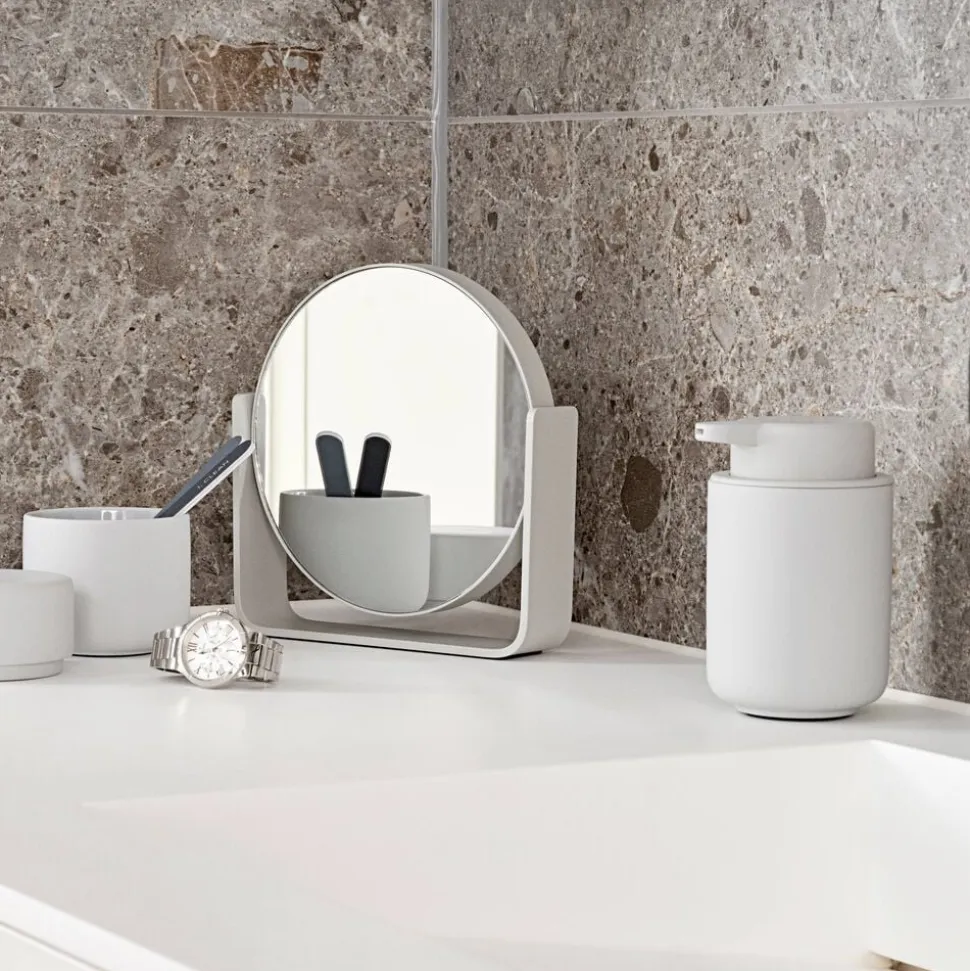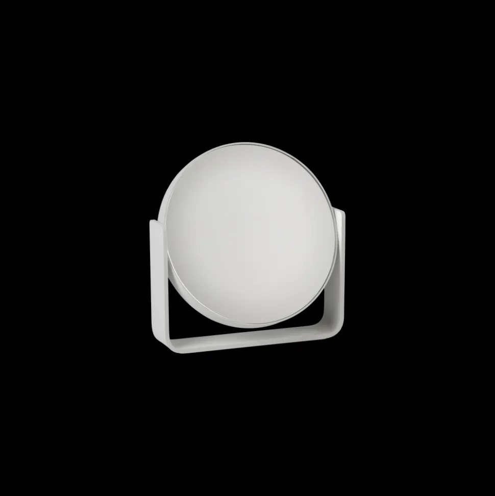 Uundværligt bordspejl, der pynter, hvor end du placerer det. Den ene side er almindeligt spejl, mens den anden forstørrer hele fem gange. Spejlet roterer sikkert om egen akse, da det bæres af en bred aluminiumsramme, som samtidig udgør spejlets stabile base. Det er pulverlakeret og har et fint mat look. Spejlet glider smukt ind i den populære UME-serie og fås i alle 7 farver: Black, White, Soft Grey, Grey, Eucalyptus, Taupe, Olive Green.