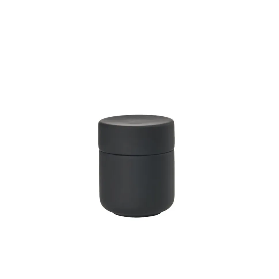 Keramikkrukken med låg har samme enkle, organiske formsprog som resten af den skønne badserie Ume. Den kan rumme dine hårspænder, makeup, vatpinde, vatrondeller eller hvad du ellers har behov for at ha’ ved hånden, men ikke nødvendigvis i syne, på badeværelset.