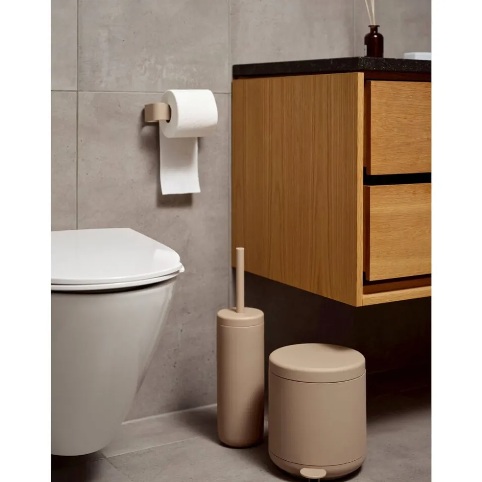 Den elegante pedalspand har samme højde som toiletbørsten, og sammen danner de et fint par på badeværelsesgulvet.