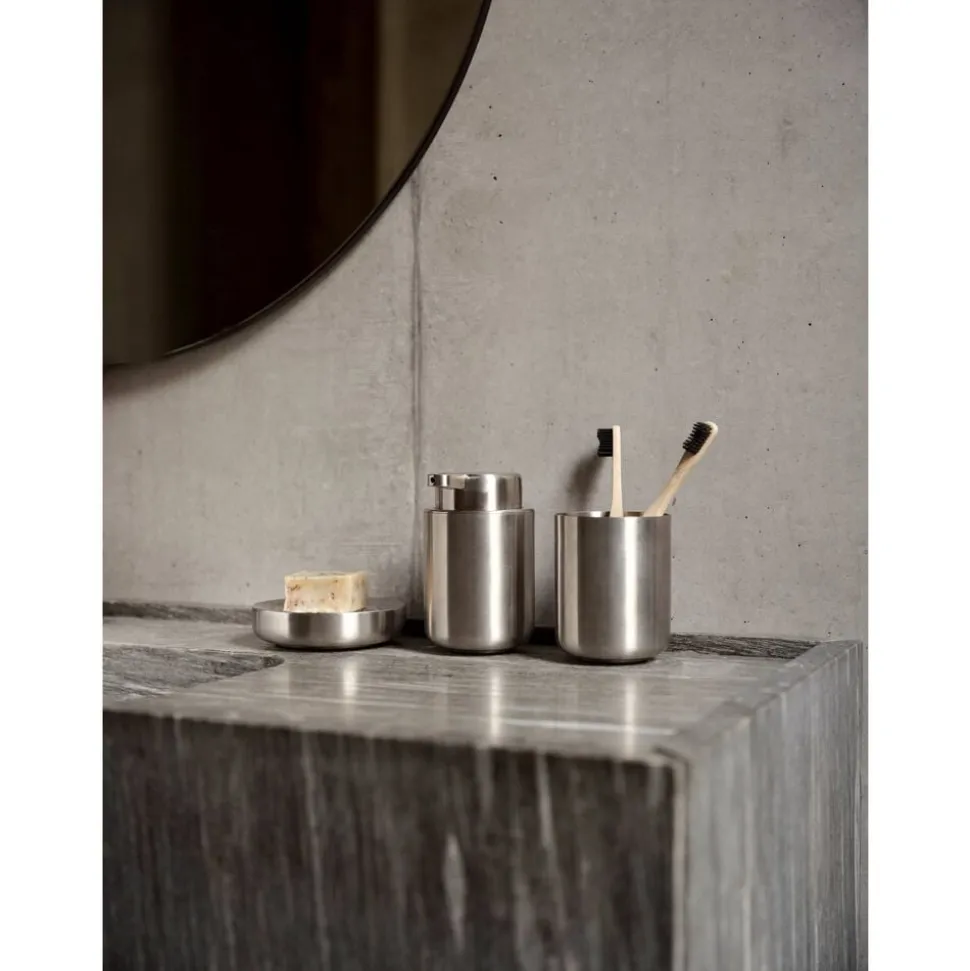 Til bordet findes både sæbedispenser, sæbeskål samt tandbørstekrus samt rundt bordspejl med vippefunktion. På trods af stålets mathed reflekterer lyset sig smukt i overfladen og giver overfladen liv og karaktér. Alt i alt en formfuldendt forvandling af en ægte Zone-klassiker.