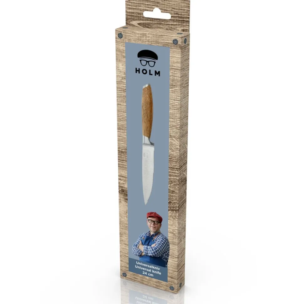 HOLMs knivserie indeholder en række lækre knive. De flot rundede skafter, der ligger behageligt i hånden, er af akacietræ med virkeligt smukke og karakteristiske åretegninger og er afsluttet med en elegant stålkappe for enden af skaftet. Bladene er af rustfrit stål i høj kvalitet. Knivene skal vaskes i hånden med varmt vand og sæbe, også før første brug.