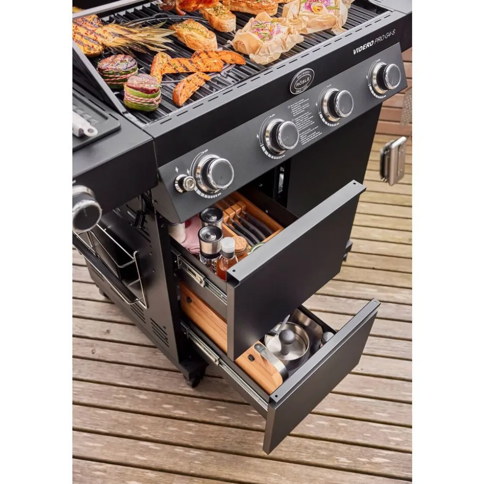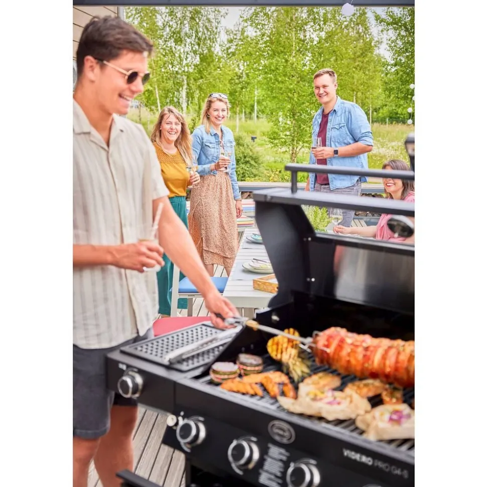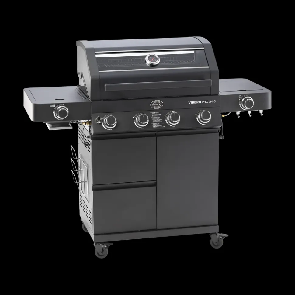 Rösle Videro Pro G4-S gasgrill i mat sort med mange funktioner. Gasgrill med 4 hovedbrændere lavet af rustfrit stål (hver 3,5 kW). Hovedgrillområde: 70 × 45 cm. Opvarmningsstativ: 70 × 16 cm. Kraftigt grillgitter af emaljeret støbejern giver de klassiske grillstriber. Det unikke og fleksible VARIO+ grillsystem giver mange anvendelsesmuligheder: Grillen indeholder tre riste, hvoraf den runde kan fjernes og erstattes af en pizzasten (23937), en grillplade (24145), en gryde (24404) eller en wok (24143), som kommer tæt på varmekilden og derved kan opnå høj varme. Den smarte holder gør det nemt at opbevare pizzasten og grillplade. 20500 watt. 30 mbar.